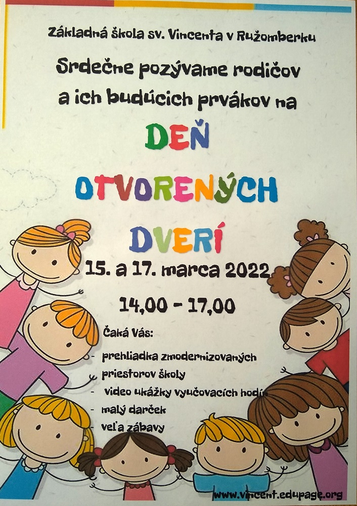 Základná škola sv. Vincenta v Ružomberku srdečne pozýva rodičov a ich budúcich prvákov na Deň otvorených dverí, ktorý bude prebiehať 15. a 17. marca 2022.